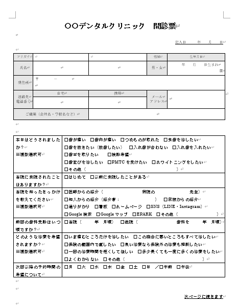 歯科医院で頻繁に聴取される設問内容(上記の赤字となっている設問項目)をまとめた問診票のテンプレートをダウンロード可能できます。Wordファイルとなっておりますので、ダウンロード後にご自身で不要な項目の削除・新しい項目の追加が可能となっております。